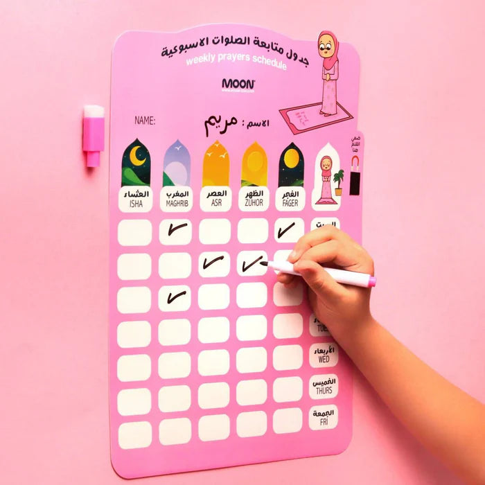جدول متابعة الصلوات الاسبوعية بخاصية أكتب و امسح مع قلم ماركر لوحة من الكرتون مع لاصق من الخلف مقاس اللوحة تقريبا 33*23 سم تقريبا مع مكان مخصص للقلم لوضعه على اللوحة بالمغناطيس لحفظه من الضياع