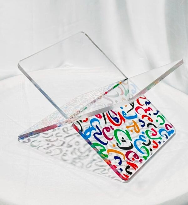 حامل المصحف الأكريليكي هذا، المزين بأحرف عربية متعددة الألوان مطبوعة بتقنية الأشعة فوق البنفسجية، قطعة فنية رائعة التصميم تجمع بين المتانة والجمال والأناقة الإسلامية. مصنوع من أكريليك شفاف عالي الجودة بسماكة 8 مم، يوفر دعماً قوياً مع الحفاظ على مظهر أنيق وعصري.